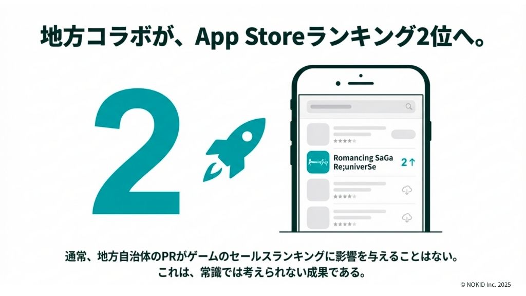 ロマンシング佐賀が生み出した成果の中でも本質的に価値を発揮したものは、佐賀県コラボ期間中に『ロマンシング サガ リ・ユニバース』のApp Storeランキングが最高2位に到達したという事実です。