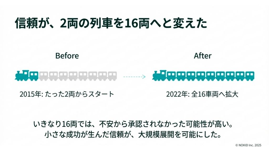 2両から始めたことで、「実際にやってみたら、住民の反応も良かった」「ファンも喜んでくれた」「メディアにも取り上げられた」という実績・信頼関係が生まれ、16車両という大規模展開が実現したのです。