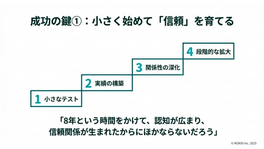 ロマンシング佐賀が10年以上も続いている理由は、まったく逆のアプローチを取ったからです。「小さく始めて、テストを繰り返しながら、双方の関係を深めた上で、段階的に施策を拡大していった」のです。