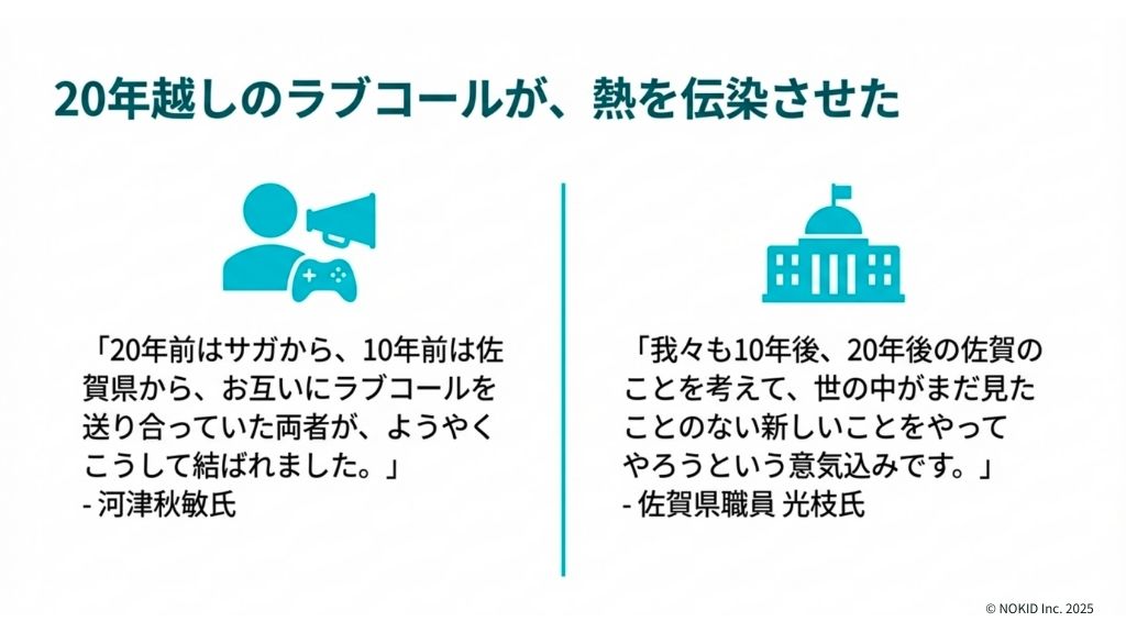 そして、この愛情は佐賀県側にも伝染しました。佐賀県職員の光枝氏は、「我々も単に時流に乗るということではなく、10年後、20年後の佐賀のことを考えて、世の中がまだ見たことのない新しいことをやってやろうという意気込みでやっています。」と語っています。