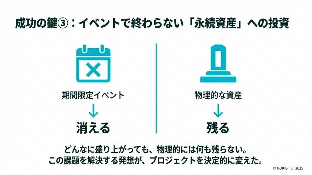 なぜなら、「残るもの」には、一時的なイベントにはない3つの価値があるからです。