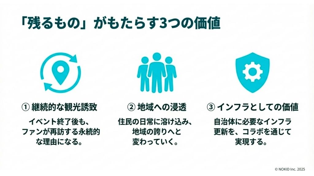 多くの自治体が、コラボ予算のほとんどをイベント開催費や広告費に使ってしまいますが、ロマンシング佐賀は予算の一部を「残るもの」に投資することで、永続的な価値を創造しました。