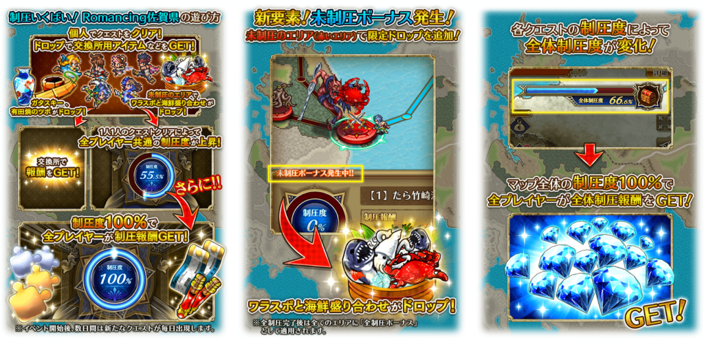 新イベント「制圧いくばい!Romancing佐賀県」では、プレイヤーがバトルクエストをクリアすることで佐賀県マップを制圧していく仕組みが実装され、「ガタスキー」や「有田焼のツボ」、「ワラスボと海鮮盛り合わせ」といった佐賀県にまつわるアイテムが登場したのです。