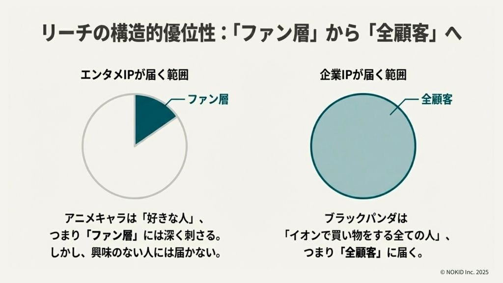 一方、ブラックパンダは「イオンで買い物をする全ての人」に届きます。つまり、小売IPは「ファン層」ではなく「全顧客」にリーチできるという構造的な強みがあるのです。