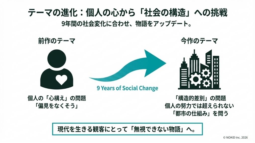 2016年の前作では、「偏見は誰の心にもある」という個人の内面(マインドセット)に焦点が当てられていました。しかし、それから9年が経ち、心構えだけでは解決できない都市の構造や歴史そのものに組み込まれた差別があることに、多くの人が気づき始めました。