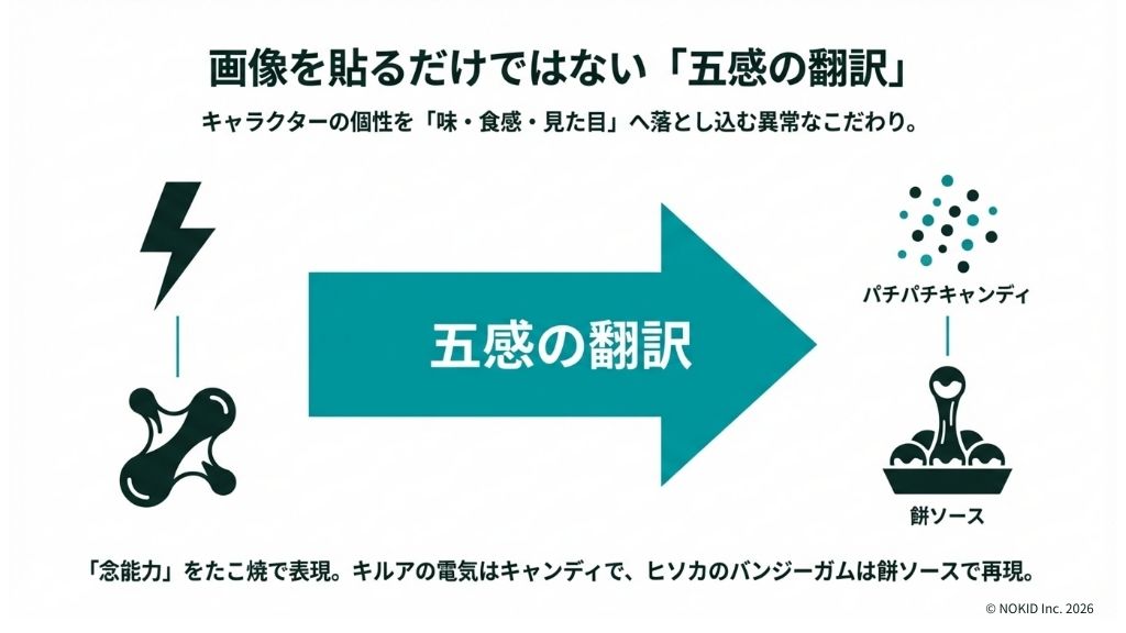 例えば、 今回のコラボ商品開発において、開発チームは作中の特殊能力「念能力」をたこ焼で表現するために、異常なまでのこだわりを見せました。特にキルアの「電気に変化するオーラ(電光石火)」を表現するために、口の中でパチパチと弾けるキャンディをトッピングに採用したことは、体験してみたい欲求を刺激する良いアイデアではないでしょうか。