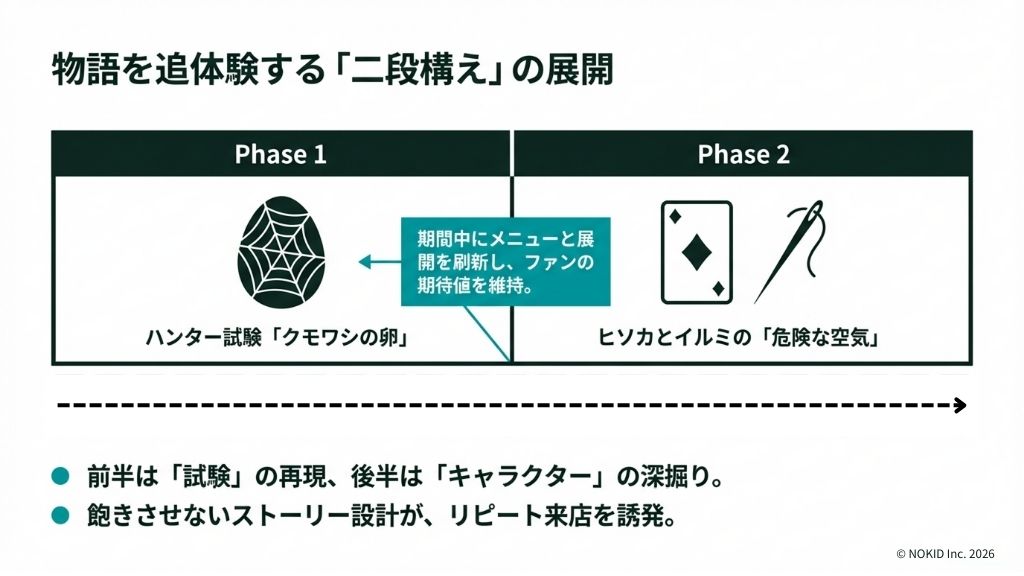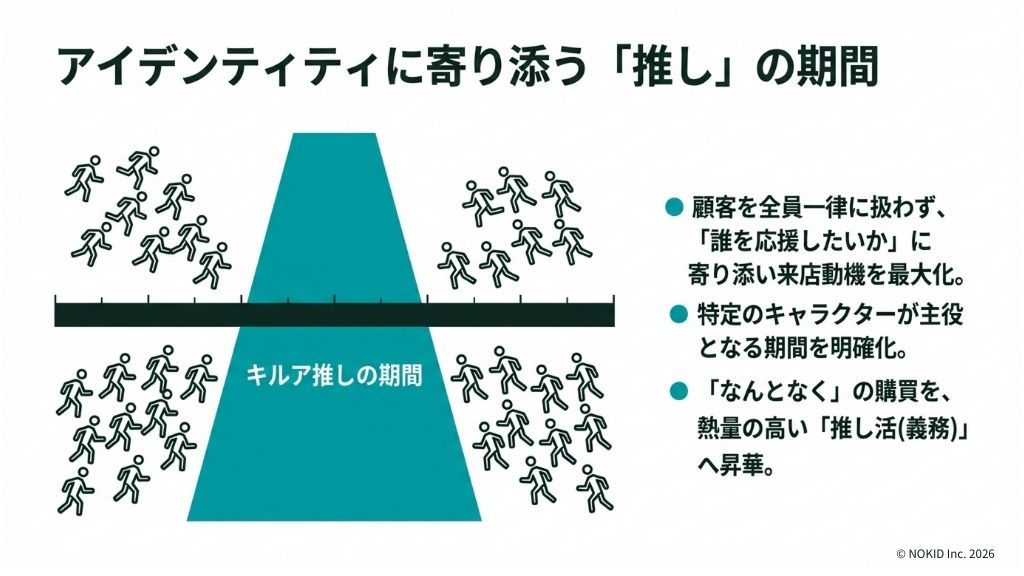 つまり、期間を分けるという手間のかかる運営を行うことで、顧客の購買行動を熱量の高い「推し活」へと昇華させ、来店目的を強化したのです。