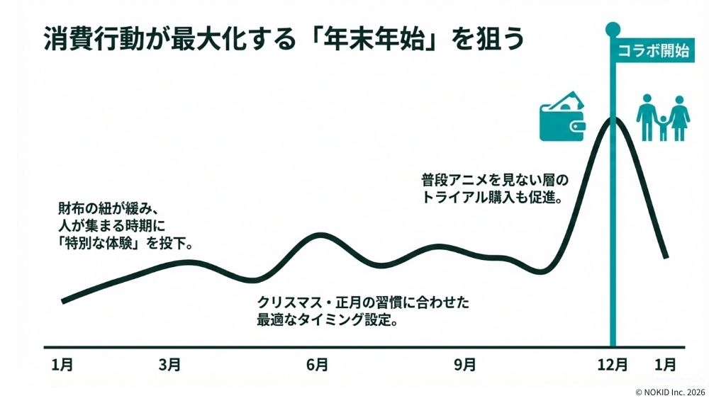 例えば、 2023年12月12日から翌年1月末というスケジュールは、クリスマスや正月といったイベントシーズンと完全に重なっています。この時期は、普段アニメを見ない層も含めて「何か特別なものを食べよう」「少し贅沢をしよう」という心理が働きやすく、コラボ商品のトライアル購入を促す絶好の機会でした。