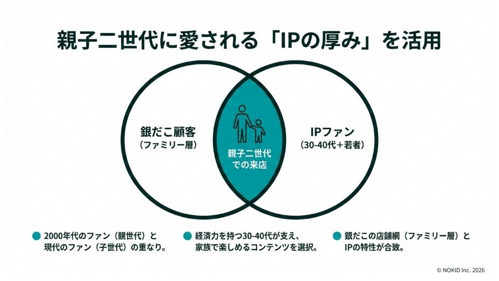 ターゲット層が狭いIPとのコラボは爆発力に欠けることがありますが、親子二世代に愛されるIPは、その弱点を補って余りあるポテンシャルを持っています。