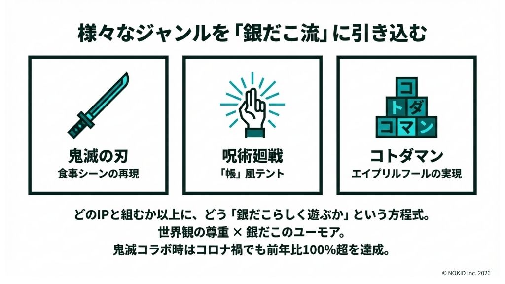 つまり、一つ一つのコラボに真摯に向き合い、ファンと同じ目線で作品の世界観を守りながらカスタマイズを行ってきた姿勢そのものが、銀だこというブランドの価値を向上させ、優良なIPが集まる磁場を作っているのです。