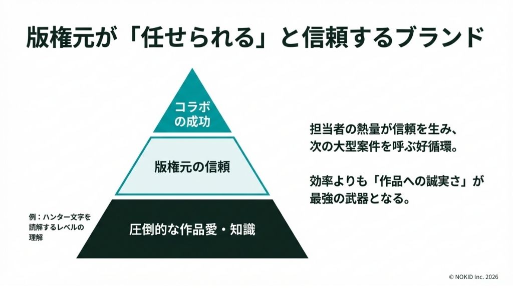 版権元も自社の大切なキャラクターを預けるわけですから、ただ利益を追求するだけの企業よりも、作品への愛と理解を示し、トラブルなく運営できるパートナーを選びたいはずです。
