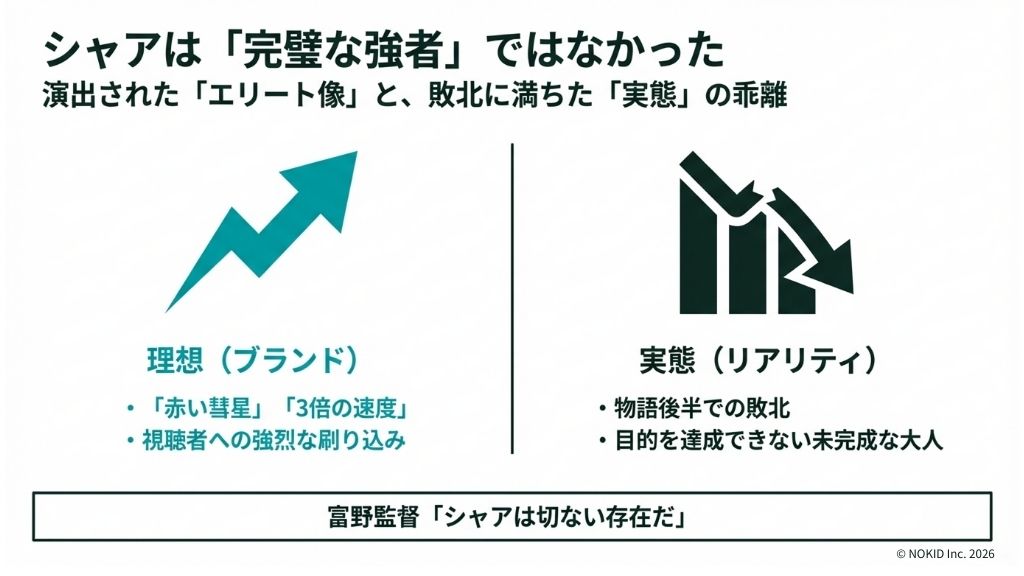 しかし、作品描写や監督の言葉を冷静に分析すると、シャアは決して「完璧」ではありません。むしろ、敗北と矛盾に満ちたキャラクターです。
