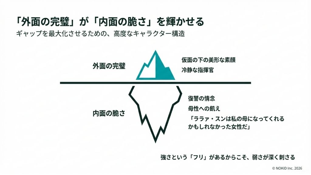 | 内面 (共感・人間味) | コンプレックス、過去のトラウマ、目的未達の焦燥、母性への飢え | 視聴者を「繋ぎ止める」 |