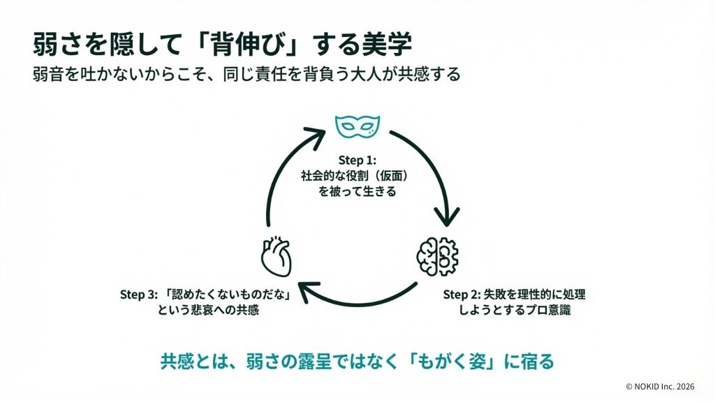 マーケターやクリエイターは、「共感」という言葉を「弱さの開示」と狭く捉えるべきではありません。「憧れ」という名の仮面を被り、その下で必死に生きる姿こそが、時代を超えて人々の心を震わせる最強のエンゲージメント装置となり得るのです。