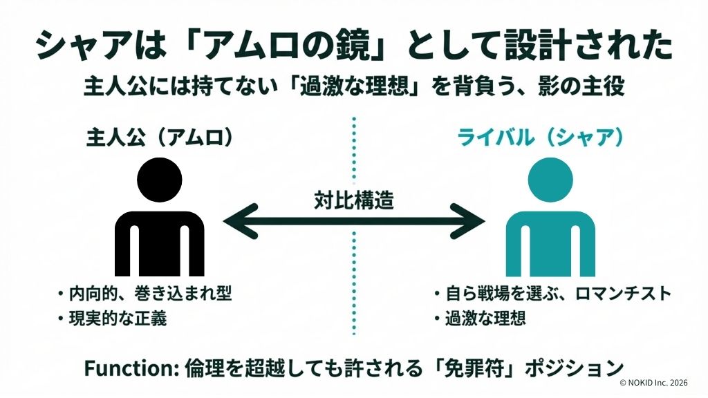 主人公であるアムロには、視聴者が自己投影するための「倫理的な正しさ」や「成長の余地」が求められます。一方、ライバルであるシャアは主人公の信条を否定・対立する「反対の視点や存在」として機能するため、主人公が持てない要素をすべて背負うことができます。