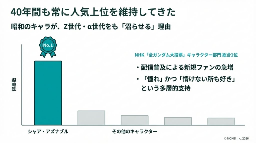 この結果が証明しているのは、NetflixやAmazon Prime Videoなどの配信プラットフォームを通じて旧作に触れた若い世代を含む新規ファンが、シャアを「古臭い」と切り捨てていないという事実です。