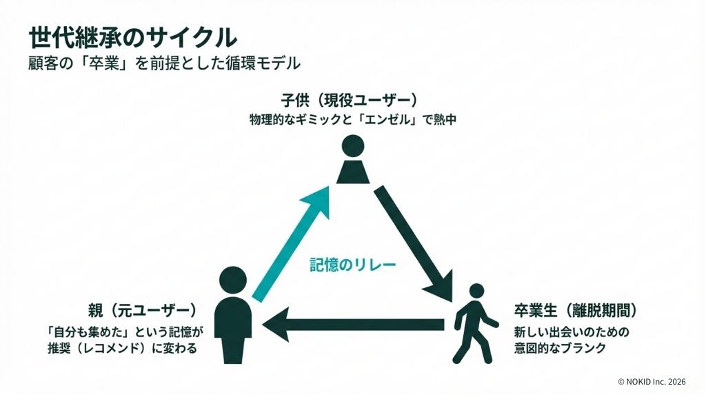 キョロちゃんが世代を超えて愛され続ける理由は、ターゲットを現在の子どもだけに限定せず、かつての顧客である親が「ブランドの語り部」となる状態を作れているからです。