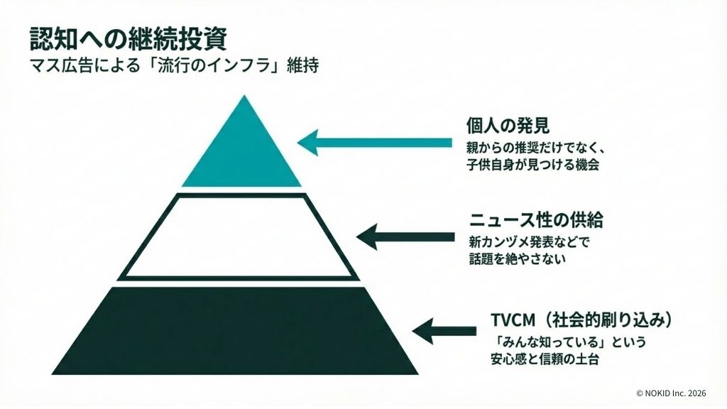 親からの推奨だけでなく、子ども自身がテレビで発見し「これ知ってる!みんな持ってる!」となる体験が、集団の中での認知定着には不可欠だからです。