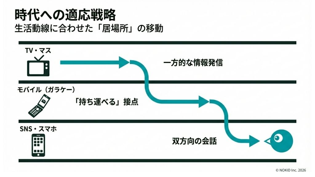 つまり、デジタル展開の本質は、ハイテクを使うことではなく、ユーザーの生活動線の変化に合わせて、キャラクターの居場所を柔軟に引っ越しさせることにあるのです。