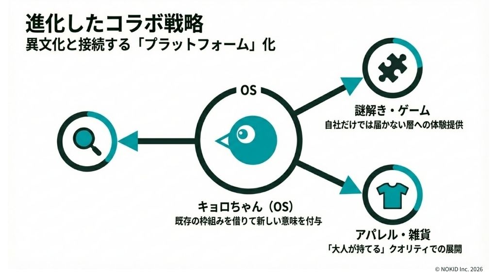 つまり、進化したコラボ戦略とは、単なる話題作りではなく、キョロちゃんというOSの上で、他社の人気アプリを動かすような「プラットフォーム化」の試みなのです。