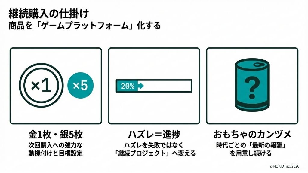 「金なら1枚、銀なら5枚」というルール設定の強みは、一度の購入で終わらせず、次回購入への強力な動機付けをパッケージ単体で完結させている点にあります。