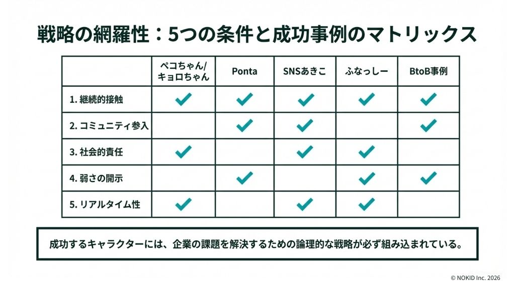 今回の各事例を調査して見えてくるのは、企業キャラクターの成功はセンスではなく設計で決まるという点です。