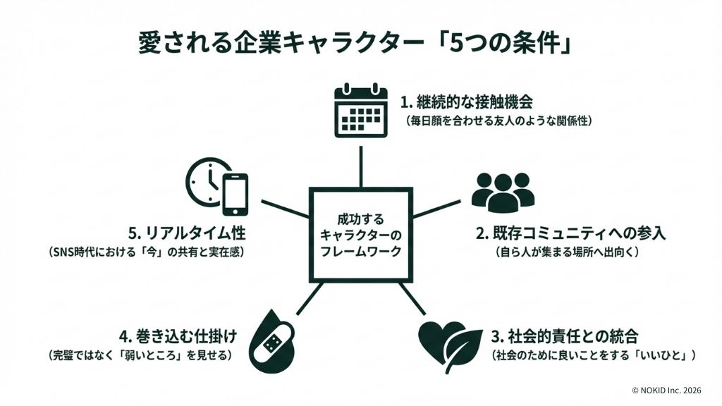 ここから個別の事例に入る前に、成功するキャラクターに共通するフレームワークを先に提示します。電通の糸乘健太郎氏は、キャラクターが愛される条件として五大要素を提唱しています。この5つの条件を読解レンズとして持っておくことで、あとに続く事例分析から実務に活かせるヒントを効率よく抽出できます。