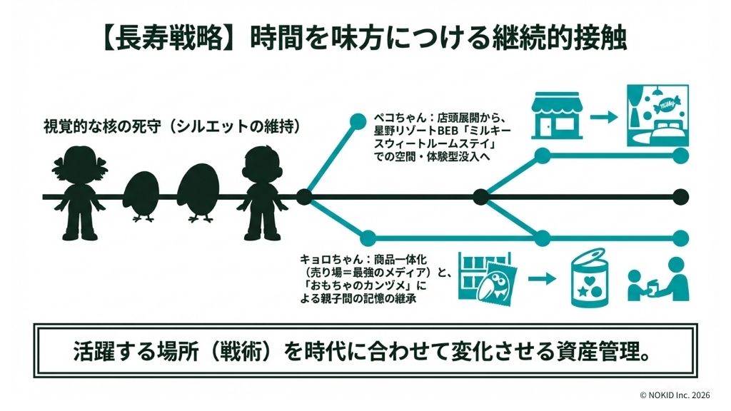 この構造こそが、キャラクターの命運を左右します。たとえば、キョロちゃんは商品が棚にある限り常に現役の広告塔として機能し続けます(→条件1)。商品とキャラクターが一体化しているため、広告費をかけられない時期でも、売り場という最強のメディアで露出を維持できるのです。
