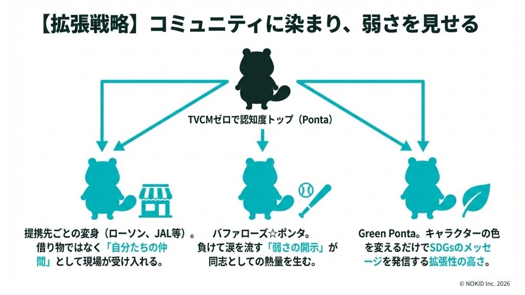 Pontaの戦略で最もユニークな点は、提携企業ごとにPontaが変身することです。ローソンでは店員の制服、ゲオではまた別のユニフォーム、JALではパイロットの姿というように、提携先のブランドカラーに染まります。