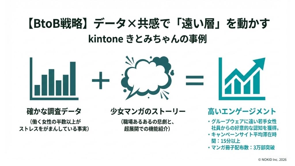 結果として、キャンペーンサイトの平均滞在時間は15分以上を記録し、マンガ冊子の配布数は3万部を超えました。グループウェアという、現場の若手女性社員からは本来遠いプロダクトに対して、好意的な認知を獲得することに成功した事例です。