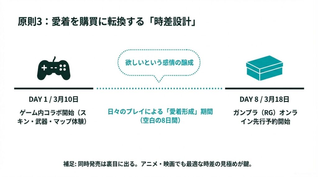 3つ目は、デジタル体験で愛着を形成してからリアルに転換する時差の設計です。同時発売ではなく、体験への没入期間を確保してから物理商品を投入します。今回の8日間という長さは、ゲームの特性に最適化された数字です。アニメなら放送クール中盤、映画なら公開2~3週目と、媒体ごとに最適な時差は異なります。
