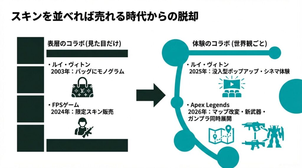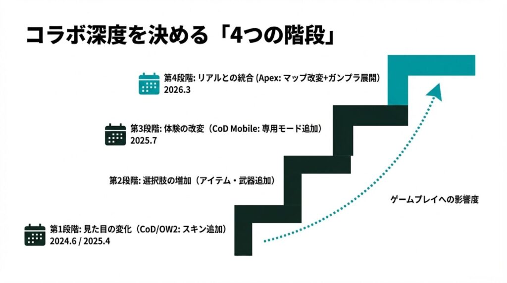2024年6月のCoDスキンから、2026年3月のApex体験書き換え型まで、わずか2年。この間にIPコラボの設計思想は根本から変わりました。