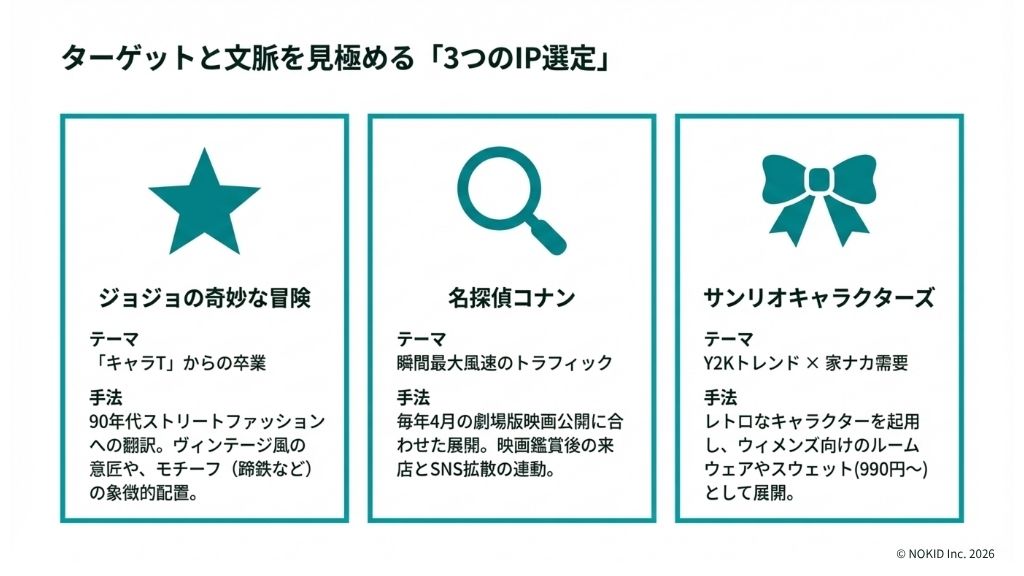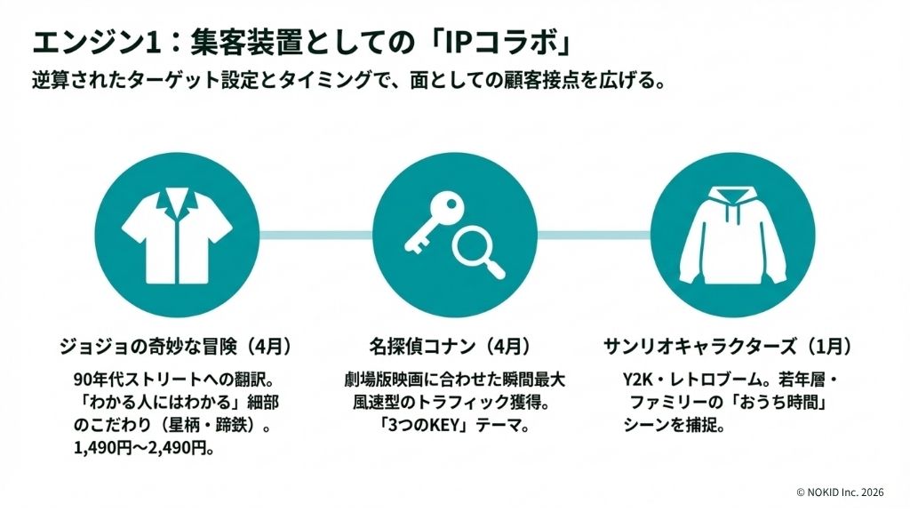 ジョジョ、コナン、サンリオ。ジャンルもターゲットも価格帯も異なる3つのIPコラボに共通しているのは、いずれも店舗やECへのトラフィックを生み出す装置として設計されているということです。