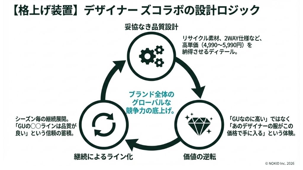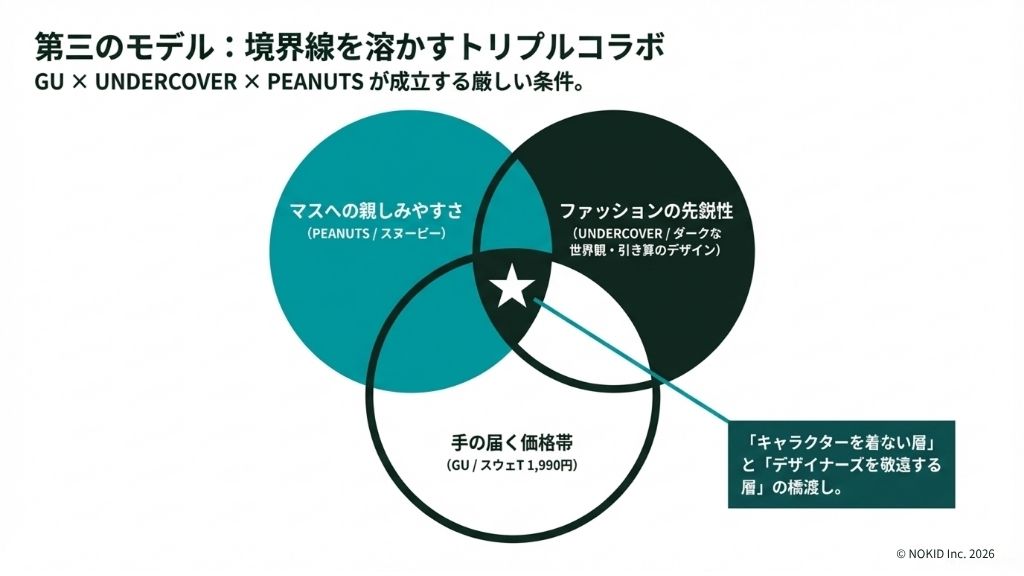 このトリプルコラボは、IPコラボとデザイナーズコラボの境界線を意図的に溶かす第三のモデルです。IPの親しみやすさを入り口にしつつ、デザイナーズの先鋭性でファッション好きを納得させ、マスブランドの価格で全国に届けます。通常は「キャラクター物は着ない」というファッション層にリーチし、逆に「デザイナーズブランドは敷居が高い」と感じるエントリー層にハイエンドなクリエイションを届ける橋渡しとして働いています。