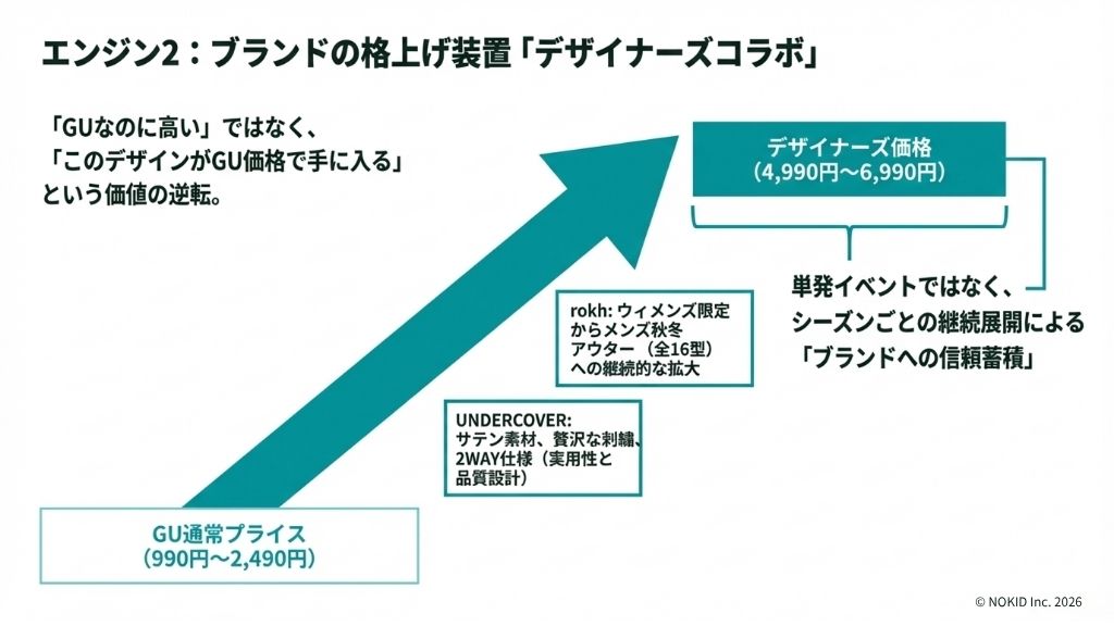 さらに重要なのは、UNDERCOVERとの協業が単発のイベントではなく、シーズンごとにテーマを変えながら継続展開されている点です。継続的なライン化によって、消費者の間に「GUのUNDERCOVERラインは品質が高い」という信頼が蓄積されていきます。