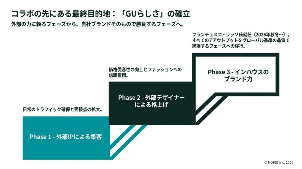この人事が意味するのは、GUが次々と異なるブランドの力を借りて売上を作るフェーズから、すべてのプロダクトラインを一つの「GUらしさ」で統括するフェーズへと移行しようとしているということです。