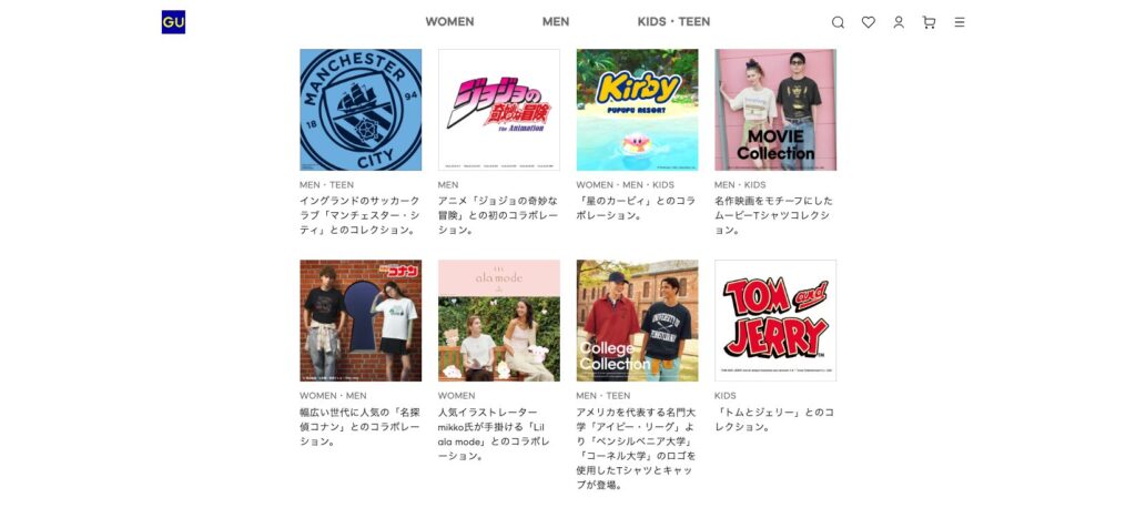 ここから先は、GUのIPコラボとデザイナーズコラボの具体的な事例を順に見ていきます。まずは、コラボ全体の6割以上を占めるIPコラボの設計から読み解いていきましょう。