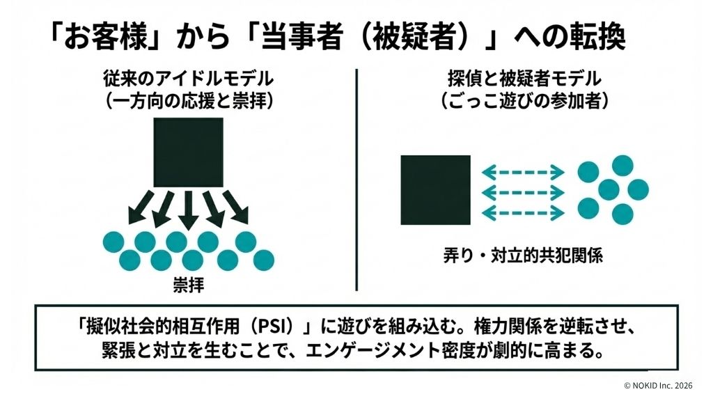 要因1は役割設計です。探偵と被疑者という対立的共犯関係が、視聴者を物語の当事者に変え、高い帰属意識と行動動機を創出しました。