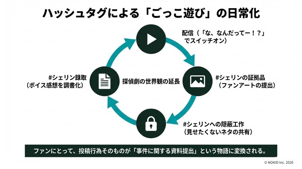 配信が始まれば「な、なんだってー!?」という合図で探偵劇のスイッチが入ります。配信が終わっても、ハッシュタグによって世界観は延長されます。この循環が、コミュニティの帰属意識を極限まで高めています。