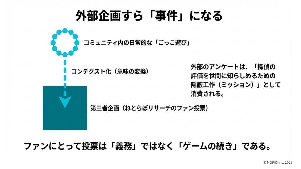 つまり、外部の投票企画が、コミュニティ内の物語に自動的に組み込まれる設計になっています。ファンにとって投票は義務でもお願いでもなく、自分たちのゲームの続きなのです。