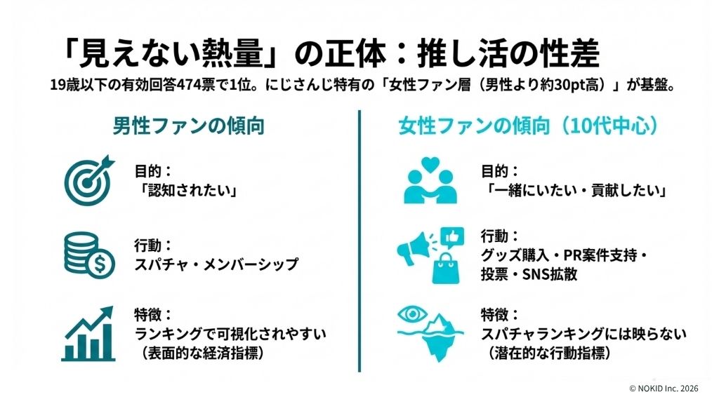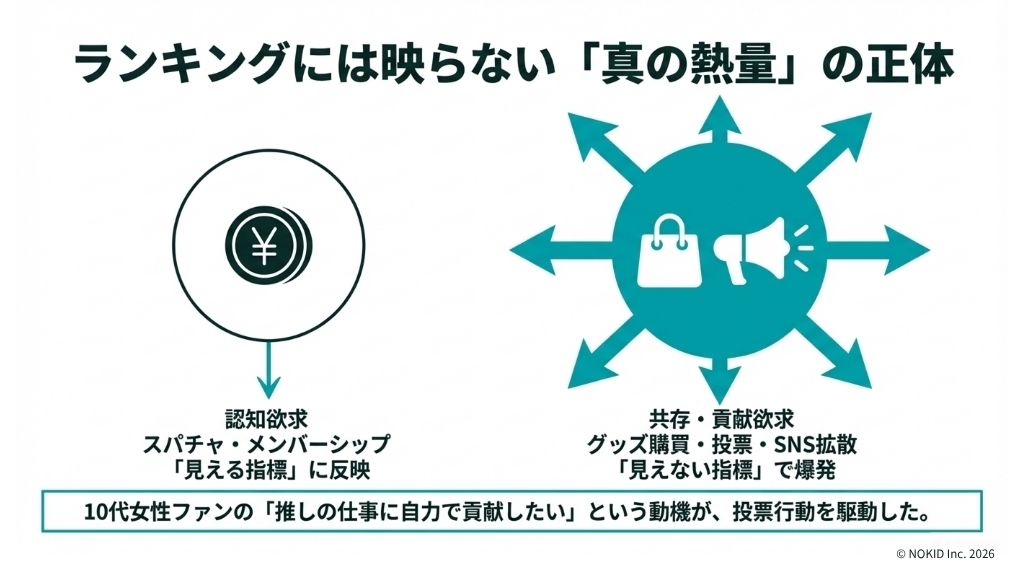 要因3は支持層の特性です。10代女性ファンの集中が、経済的支援(スパチャ)ではなく行動的支援(投票・拡散・グッズ購買)における圧倒的な組織力を生みました。