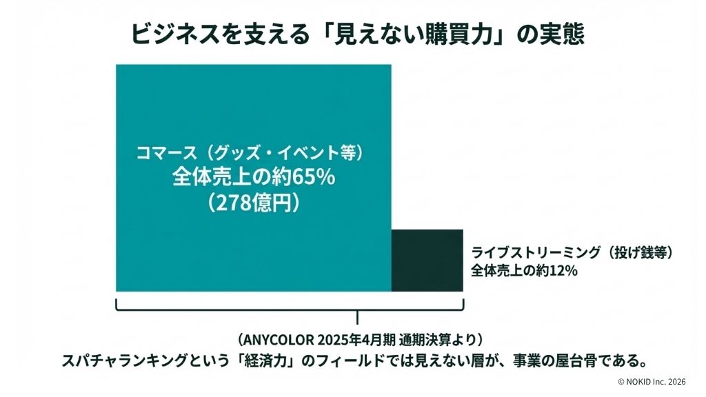 ANYCOLORの2025年4月期決算によれば、売上高は428億7,700万円(前年同期比34.0%増)。そのうちコマース(グッズ・イベント等の物販)が売上の約65%を占め、278億4,200万円を記録しました。一方、ライブストリーミング(配信・投げ銭)の比率は全体のわずか約12%にすぎません。