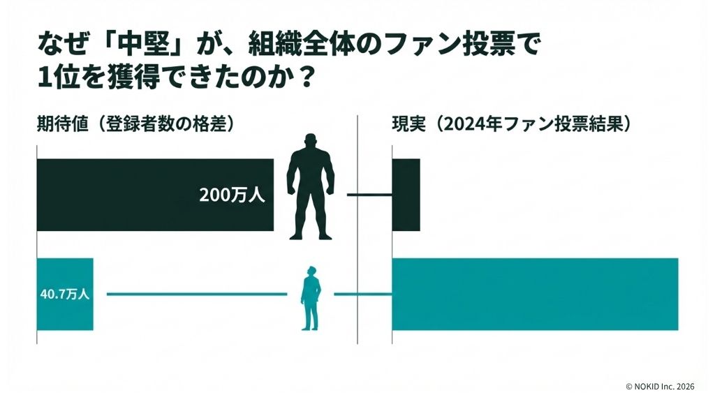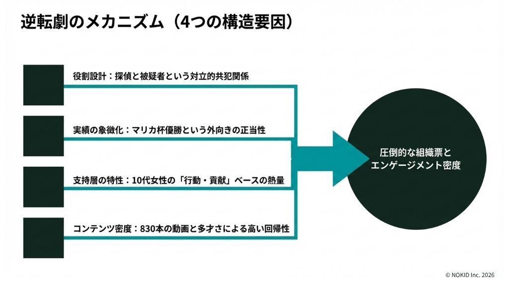 要因2は実績の象徴化です。マリカ杯優勝というジャイアント・キリングが、数字以上の価値を可視化し、外部投票における正当性を付与しました。