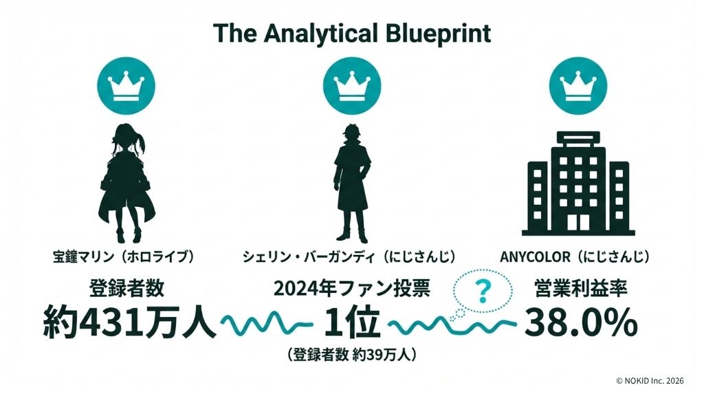 その答えは、あなたが人気で何を測ろうとしているかによって変わります。認知の広さならホロライブ。ファンの深い関係性ならにじさんじのシェリン的な構造。利益率という経営効率ならANYCOLOR。新規層の開拓と商材の多角化ならカバー。