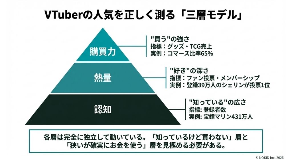 ここまでの分析を整理すると、VTuberの人気は三つの層で構成されていることが見えてきます。そして、にじさんじとホロライブの比較は、この三層が独立して動いていることの最も説得力のある証拠です。