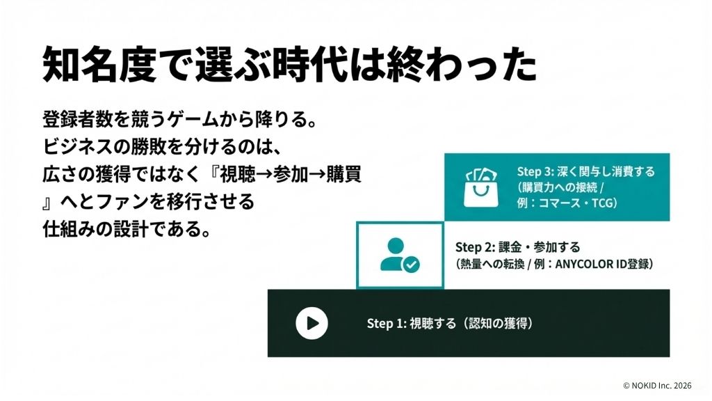 これはVTuber事務所にとって重要な示唆を含んでいます。追うべき数字は何万人に見られたかではなく、何人が関係の次のステップに進んだかです。登録者数を増やすことよりも、すでにいるファンとの関係を深める仕組みを設計する方が、収益に直結します。