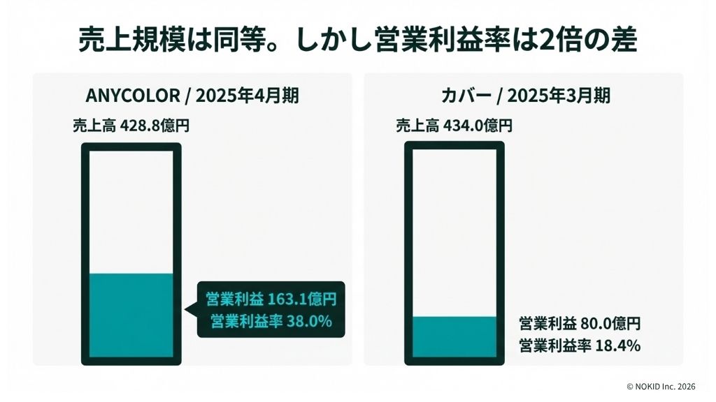 ANYCOLORの2025年4月期通期売上高は428.8億円、営業利益率38.0%。この利益率は上場エンタメ企業の中でも際立って高い水準です。