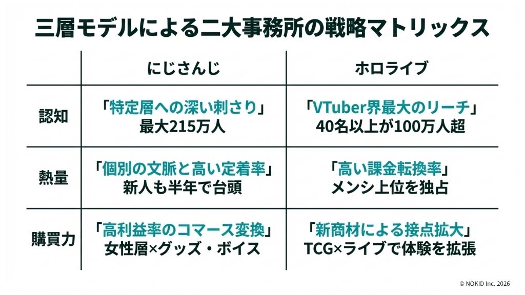 認知で劣るにじさんじが利益率で勝ち、認知で勝るホロライブがTCGで新たな購買層を開拓する⸺この構図は、三つの層が独立していることの何よりの証拠です。