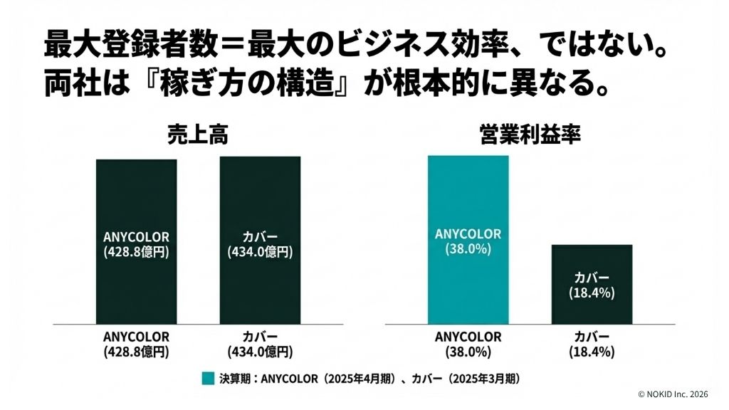 登録者数ではホロライブが圧倒しているのに、利益率ではにじさんじが大幅に上回っている⸺この事実は、登録者数が多い=ビジネスとして強いという直感的な等式が成り立たないことを明確に示しています。