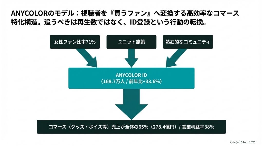 ANYCOLORは、女性ファン比率71%という強固なファンベースの購買力を、ユニット施策(複数タレントの組み合わせを軸にしたグッズ展開やイベント企画)やグッズ・ボイス企画で効率的にコマース売上に変換しています。